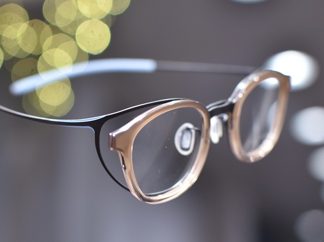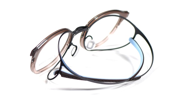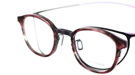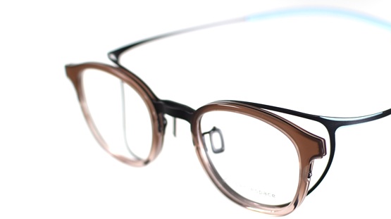 アセテートとシート状チタンを組み合わせたコンビネーションタイプのヒンジレスアイウェアは、かけここちがバツグンです。
